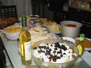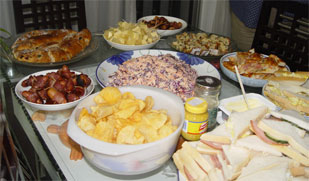 Sandwiches, salad, sauces, cookies, potato chip,bread, wine…